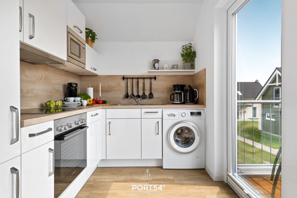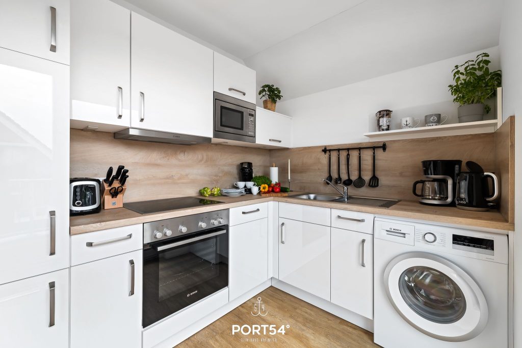 Die offene Küche schließt direkt an den Wohn- und Essbereich an und ist hochwertig sowie voll ausgestattet. Dir stehen unter anderem eine Waschmaschine, ein Geschirrspüler, eine Kaffeemaschine, ein Wasserkocher, ein Toaster und eine Mikrowelle zur Verfügung. So kannst du deinen Urlaub ganz entspannt gestalten – vom gemütlichen Frühstück bis zum gemeinsamen Abendessen.