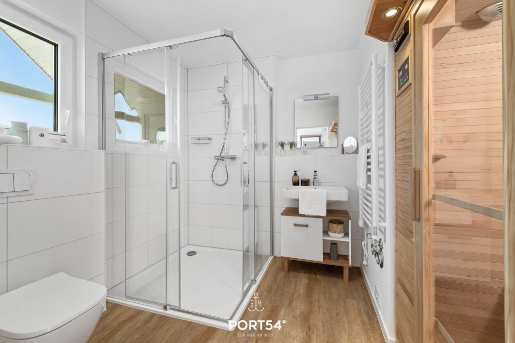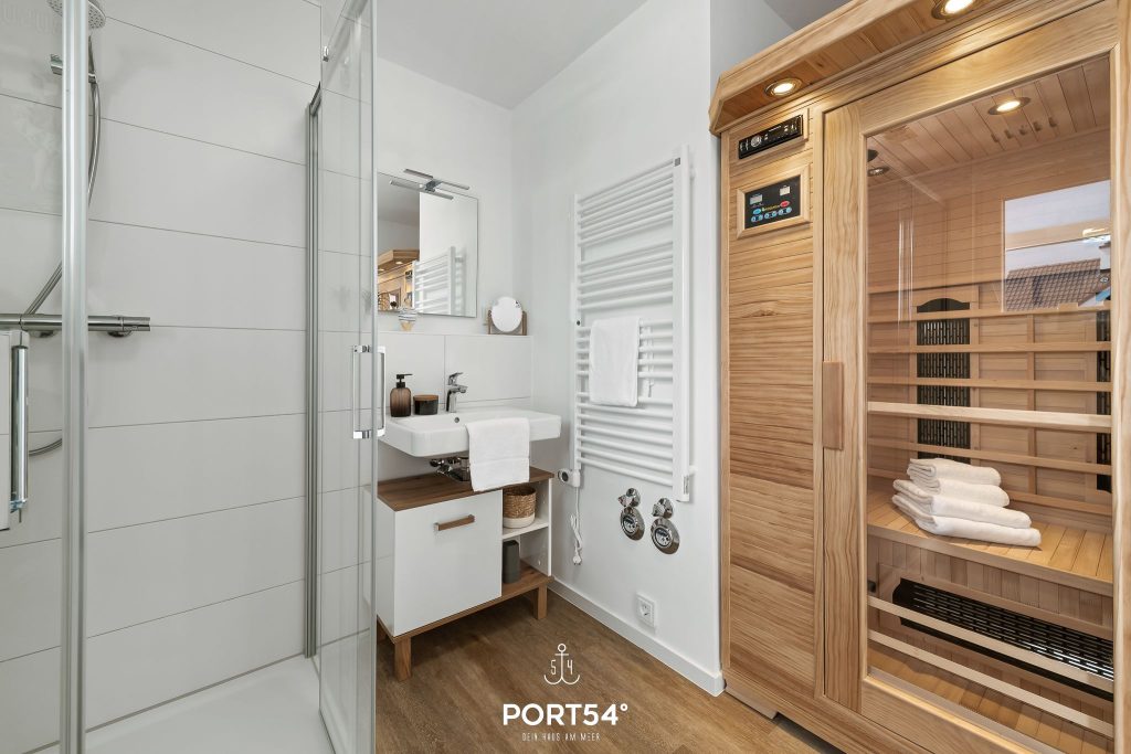 Das moderne Tageslichtbad ist mit einer bodengleichen Dusche und einem Handtuchheizkörper ausgestattet. Die Infrarotsauna macht das Badezimmer zusätzlich zu einem kleinen Wellnessbereich, in dem du nach einem aktiven Urlaubstag wunderbar abschalten kannst.