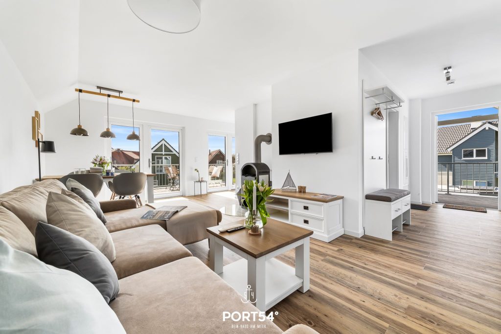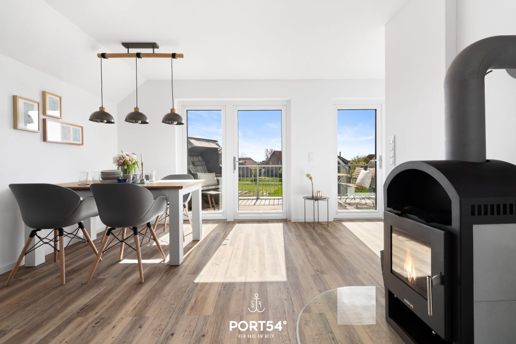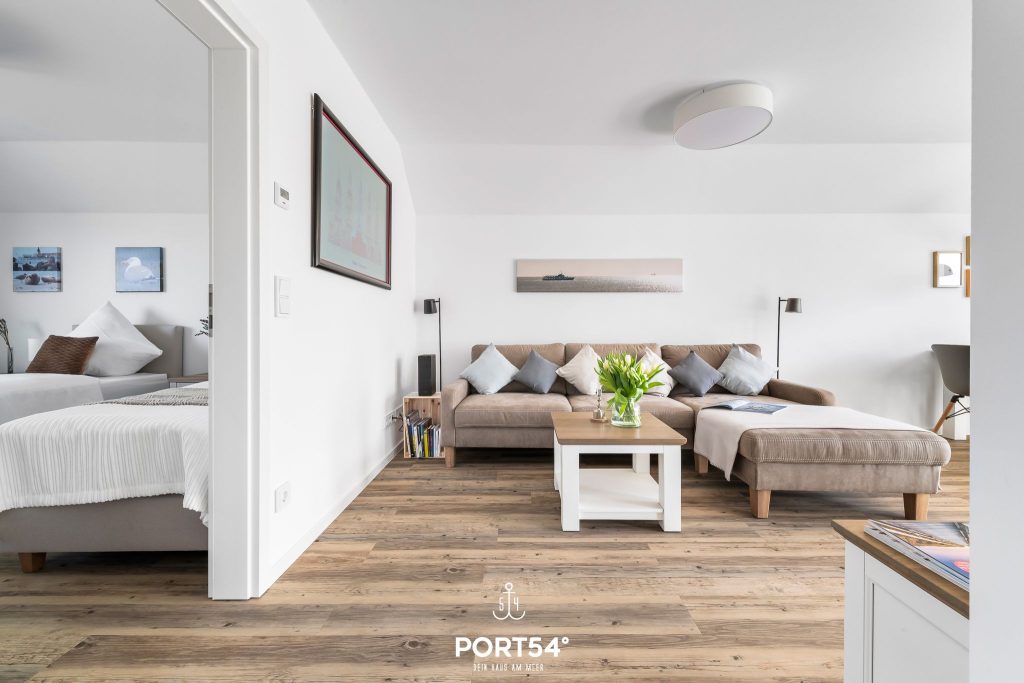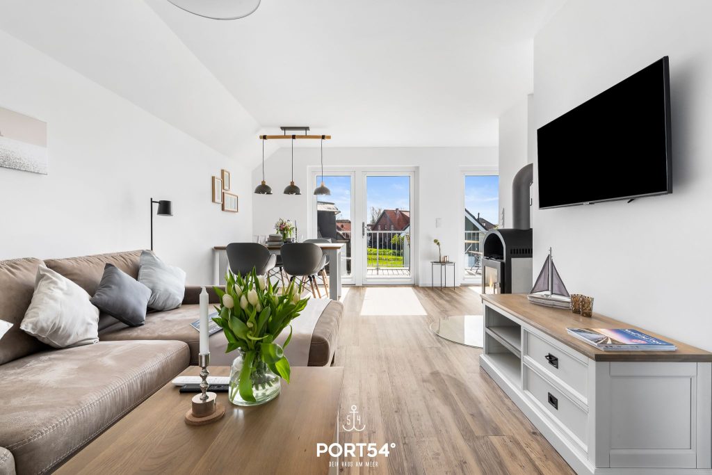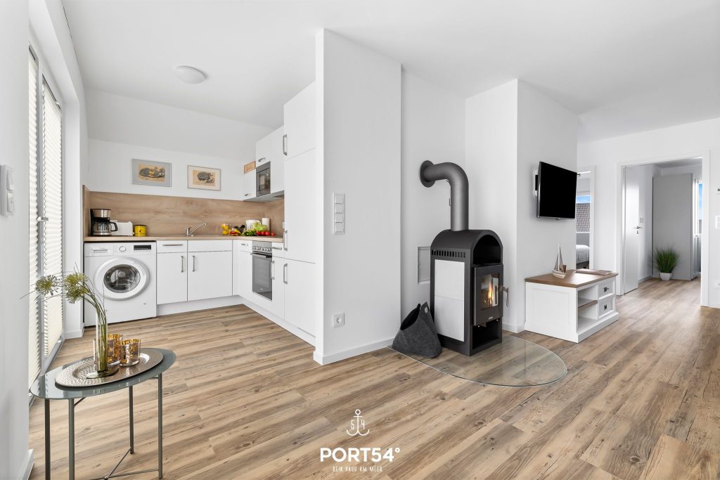Das helle Wohnzimmer lädt mit seiner gemütlichen Couch dazu ein, es dir nach einem erlebnisreichen Tag so richtig bequem zu machen. Besonders in der kalten Jahreszeit entfaltet die Wohnung ihren ganz besonderen Charme: Dann sorgt der Kamin für wohlige Wärme und eine behagliche Atmosphäre, während du auf dem Flachbild-TV deine Lieblingsserie genießen kannst. Für zusätzliche Entspannung steht dir außerdem eine Infrarot-Sauna zur Verfügung – perfekt, um dich nach einem langen Strandspaziergang aufzuwärmen und die Seele baumeln zu lassen. So wird die Wohnung auch im Herbst und Winter zu einem wunderbaren Wohlfühlort.