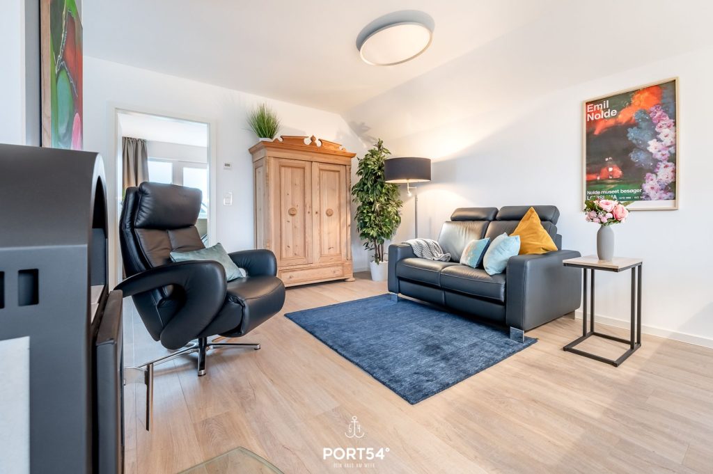 Der offene Wohnbereich lädt Dich ein, es Dir auf dem Sofa gemütlich zu machen und einfach zu entspannen. Ob ein Filmabend auf einem der beiden TVs, Musik im Hintergrund oder ein ruhiger Moment für Dich – hier findest Du genau den Platz zum Abschalten. Der Kaminofen sorgt dabei für eine wunderbar warme, stimmungsvolle Atmosphäre, besonders an kühleren Tagen. Dank Fußbodenheizung und angenehmer Wärme fühlst Du Dich zu jeder Jahreszeit rundum wohl.