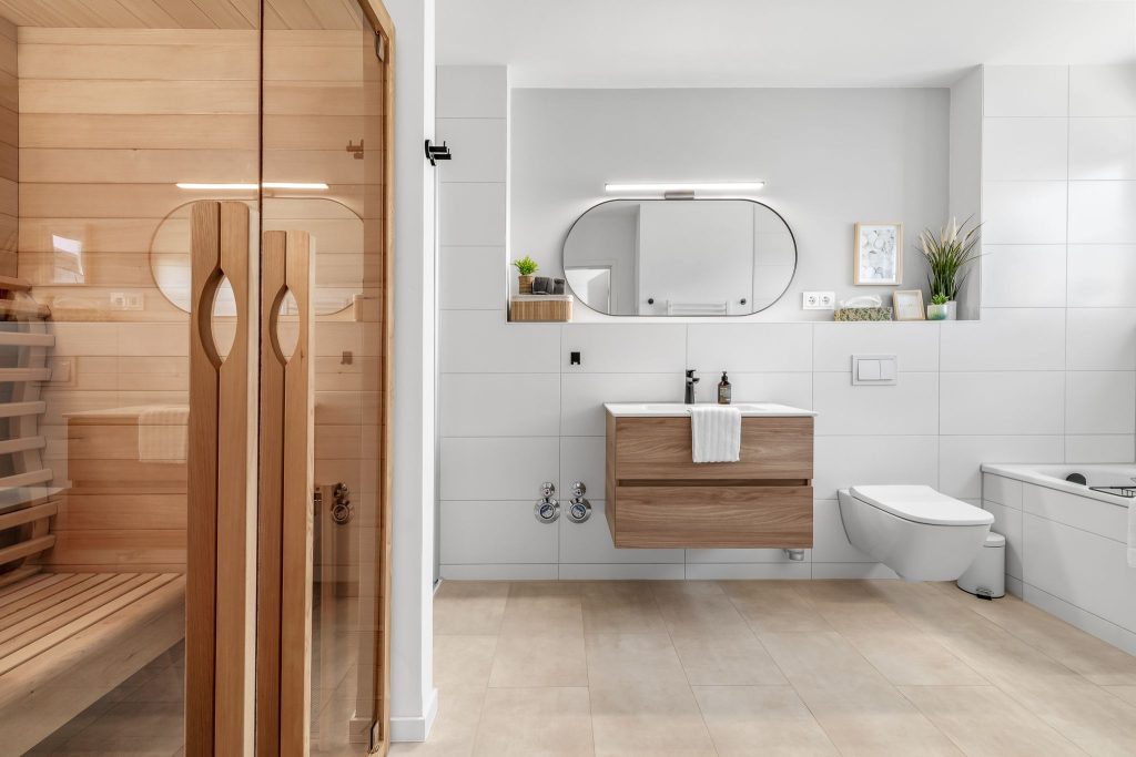 Das helle, moderne Badezimmer wird zu Deiner persönlichen Wohlfühloase. Neben einer ebenerdigen Dusche und einer großzügigen Badewanne erwartet Dich ein echtes Highlight: die Infrarot-Sauna. Nach einem frischen, windigen Tag an der Nordsee kannst Du hier wunderbar entspannen und neue Energie tanken.