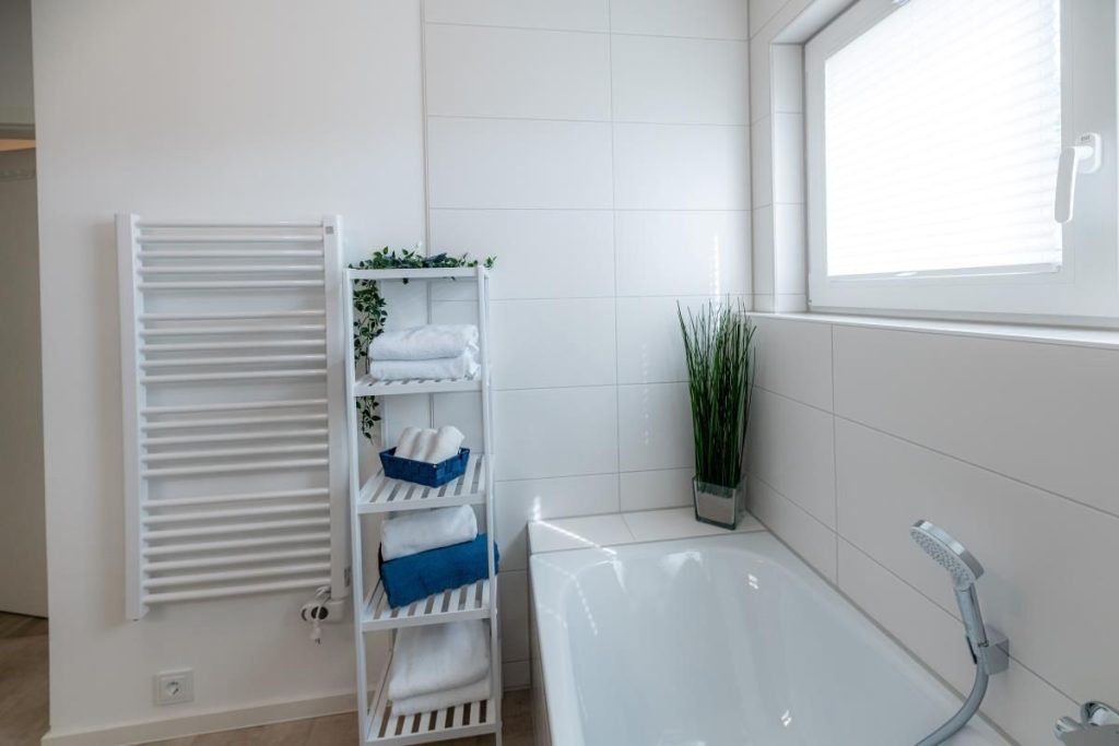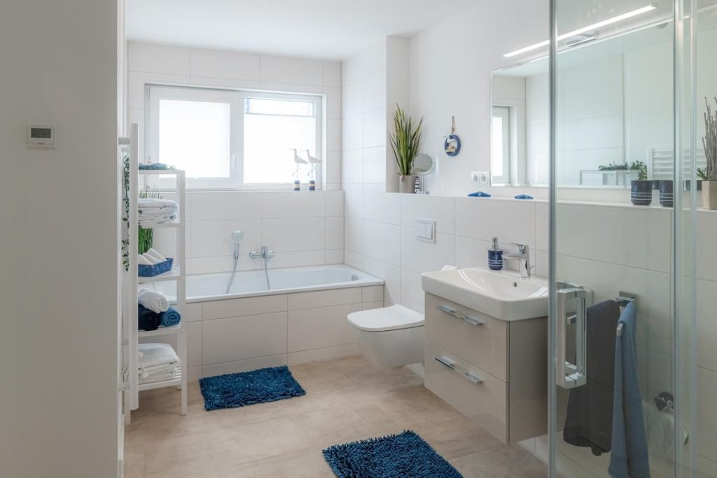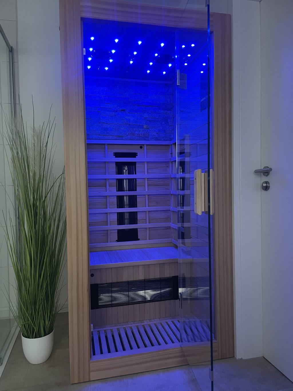 Das moderne Badezimmer wird zu Deiner persönlichen Wellnessoase. Neben einer ebenerdigen Dusche und einer Badewanne findest Du hier auch einen Kosmetikspiegel, einen Föhn und einen Handtuchtrockner. Das absolute Highlight ist jedoch die Infrarotsauna – perfekt, um nach einem langen Strandspaziergang zu entspannen, neue Energie zu tanken und einfach mal abzuschalten.