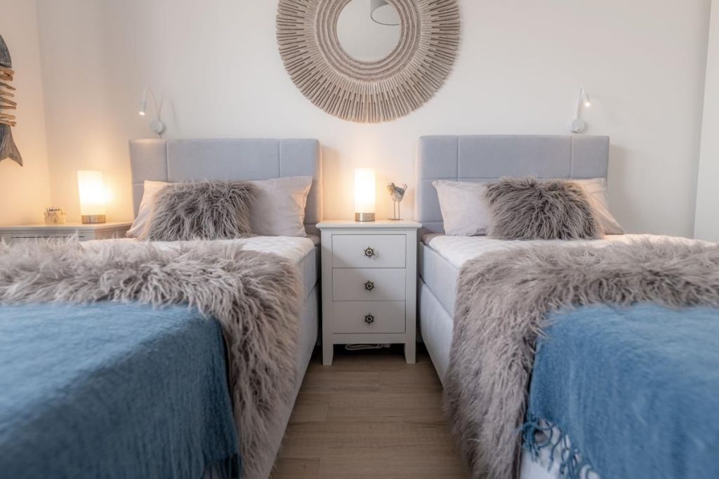 Die beiden Schlafzimmer bieten Dir den perfekten Rückzugsort für erholsame Nächte. Im ersten Schlafzimmer erwartet Dich ein komfortables Doppelboxspringbett (180x200 cm), während das zweite Schlafzimmer mit zwei flexiblen Einzelboxspringbetten (je 90x200 cm) ausgestattet ist, die sich bei Bedarf zusammenschieben lassen. Beide Räume verfügen über Smart-TVs mit Magenta TV, Verdunkelungsmöglichkeiten sowie Insektenschutzgitter – für ungestörten, tiefen Schlaf und einen entspannten Start in den Tag.