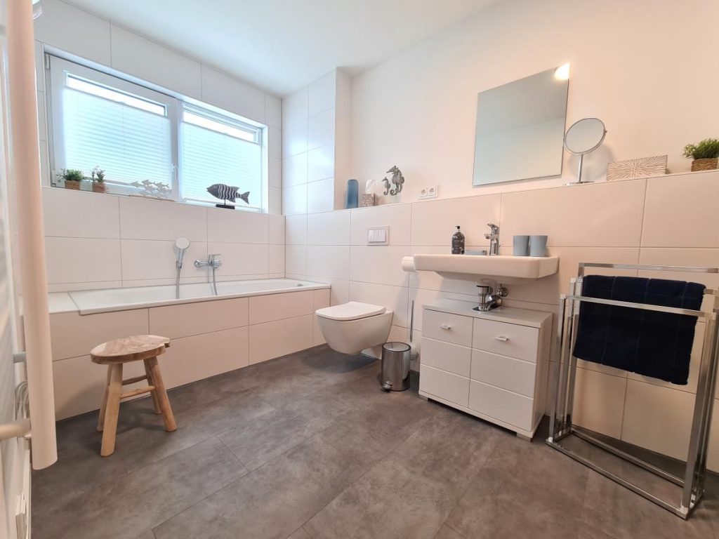Das großzügige Badezimmer wird zu Deiner ganz privaten Wohlfühloase. Neben einer ebenerdigen Dusche und einer Badewanne erwartet Dich hier ein ganz besonderes Highlight: die Infrarot-Sauna. Gönn Dir nach einem langen Spaziergang an der Nordsee eine wohltuende Auszeit, lass die Wärme auf Dich wirken und spüre, wie sich Entspannung in Deinem ganzen Körper ausbreitet.