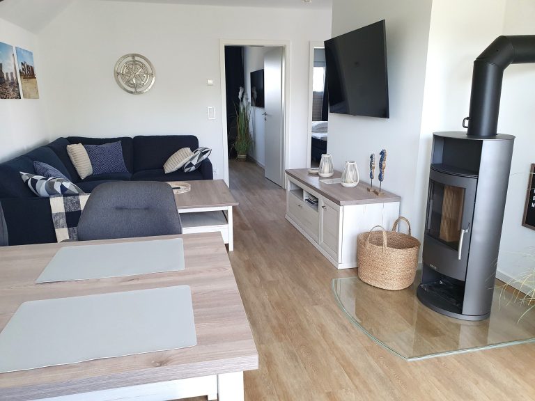 Der großzügige, offen gestaltete Wohn- und Essbereich bildet das Herzstück Deiner Ferienwohnung. Große Fenster lassen viel Licht herein und schaffen eine warme, einladende Stimmung. Auf dem kuscheligen Sofa kannst Du es Dir so richtig bequem machen, Deine Lieblingsserie auf dem Smart-TV mit Magenta TV genießen oder einfach die Seele baumeln lassen. Der Kamin sorgt dabei für eine wohlige Wärme und eine besonders behagliche Atmosphäre – perfekt für entspannte Abende, gerade wenn es draußen etwas frischer ist.