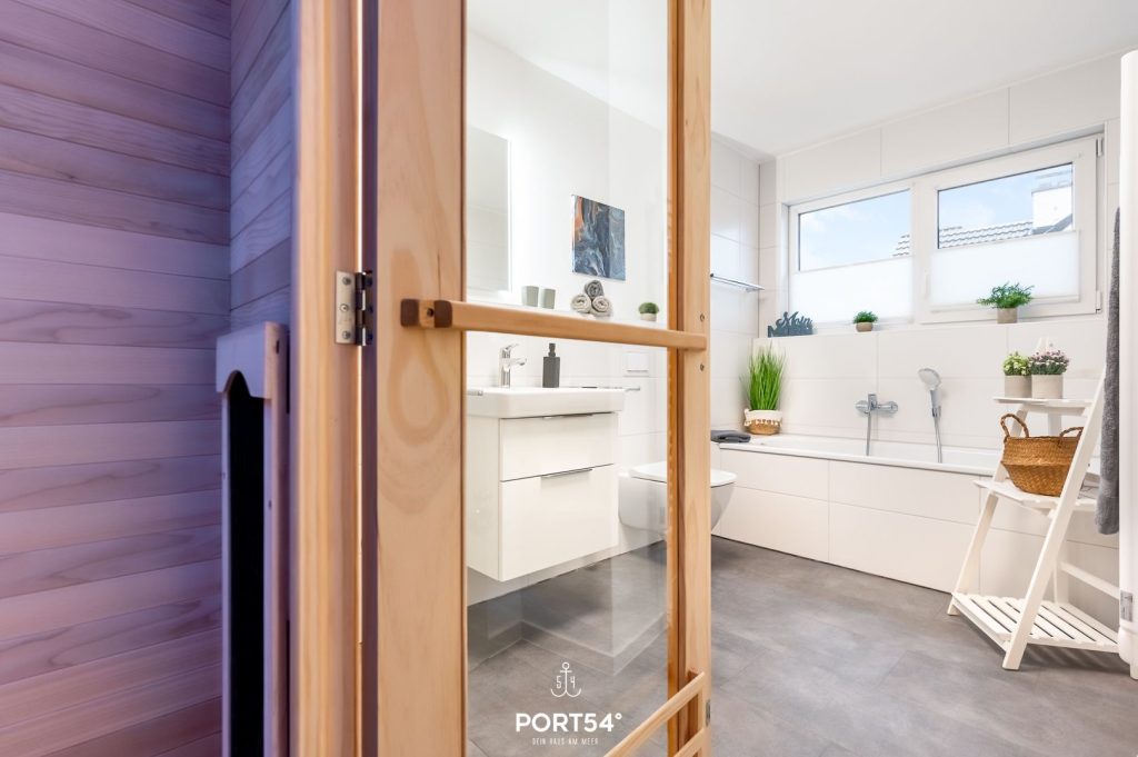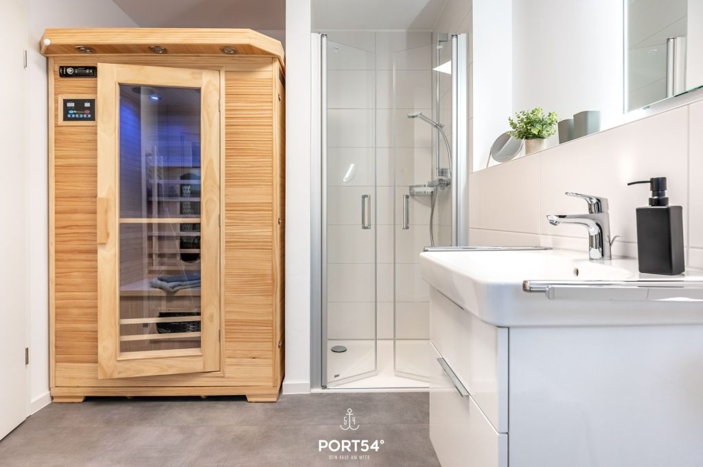 Das Badezimmer ist sowohl mit einer Dusche als auch mit einer Badewanne und einer Infrarotsauna ausgestattet – perfekt, um nach einem langen Tag am Strand oder an der Nordsee zu entspannen.