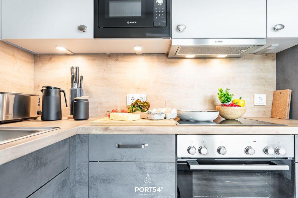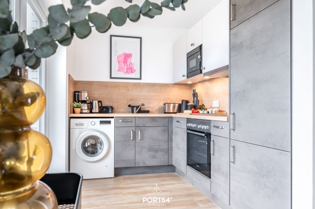Die offene Küche ist modern ausgestattet und bietet dir alles, was du für deinen Aufenthalt brauchst: Cerankochfeld, Backofen, Mikrowelle, Geschirrspüler sowie einen Kühlschrank mit Gefrierfach. Für deinen perfekten Start in den Tag stehen dir Kaffeemaschine und Nespresso-Maschine bereit. Geschirr, Besteck und umfangreiche Küchenutensilien sind selbstverständlich vorhanden.