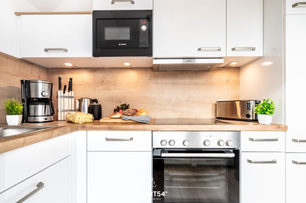 Die offene Küche ist modern ausgestattet und bietet Dir alles, was Du für deinen Aufenthalt brauchst: Cerankochfeld, Backofen, Mikrowelle, Geschirrspüler sowie einen Kühlschrank mit Gefrierfach. Für deinen perfekten Start in den Tag stehen Dir Kaffeemaschine und Nespresso-Maschine bereit. Geschirr, Besteck und umfangreiche Küchenutensilien sind selbstverständlich vorhanden.