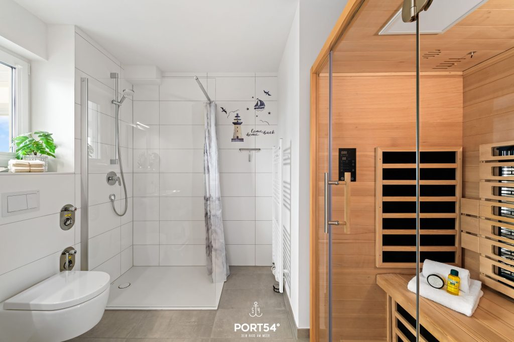 Das helle Tageslichtbad ist mit einer modernen Dusche und einer hochwertigen Infrarot-Sauna ausgestattet, die Dir pure Entspannung nach einem langen Tag am Strand bietet. Zusätzlich findest Du im Bad einen Handtuchheizkörper, einen kleinen Kosmetikspiegel und einen Föhn vor.