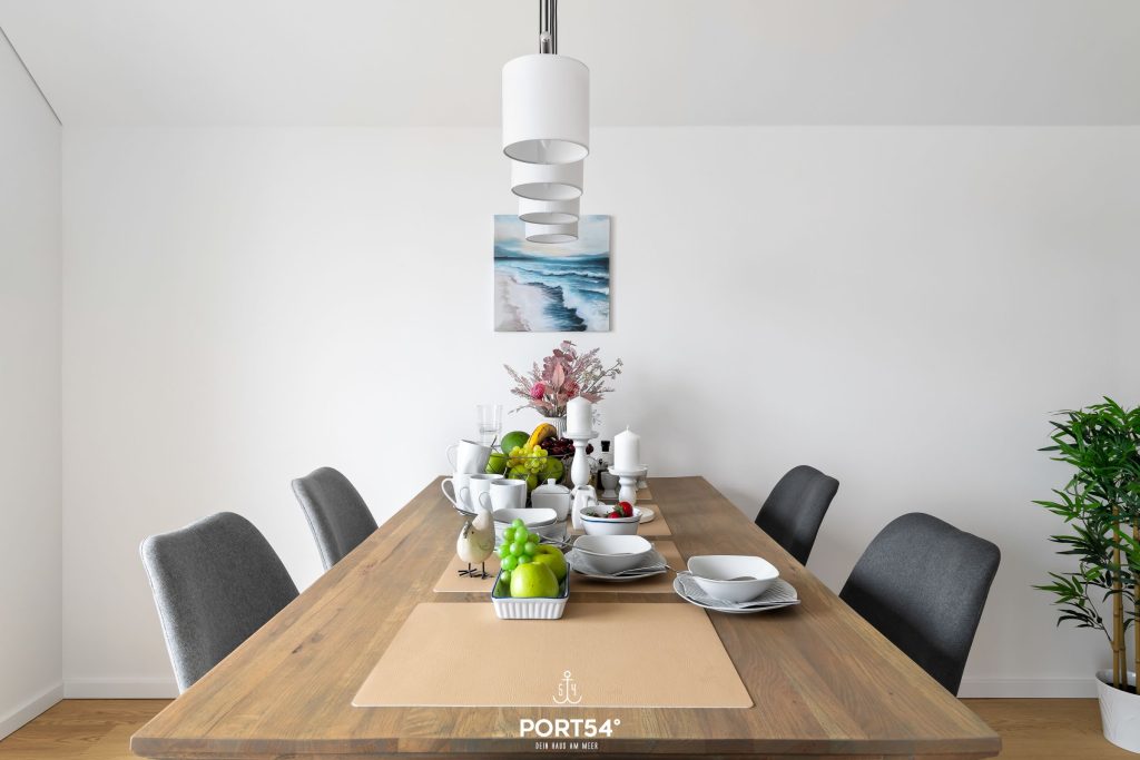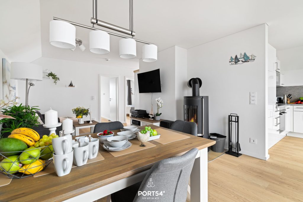 Der offene Wohn- und Essbereich ist hell und freundlich gestaltet. Hier kannst Du es Dir auf dem gemütlichen Sofa bequem machen und Dich vom Magenta-TV-Programm unterhalten lassen oder gemeinsam mit der Nintendo Wii spielen. Der Kamin sorgt an kühleren Abenden für wohlige Wärme und eine behagliche Stimmung. Für akustische Unterhaltung ist ebenfalls bestens gesorgt, denn eine hochwertige HiFi-Anlage im Wohnzimmer bietet Dir erstklassigen Klang und sorgt für die perfekte musikalische Begleitung während Deines Aufenthalts.