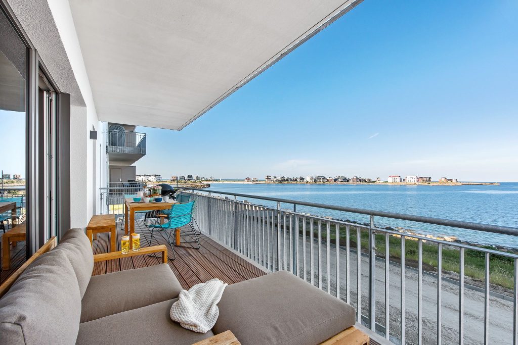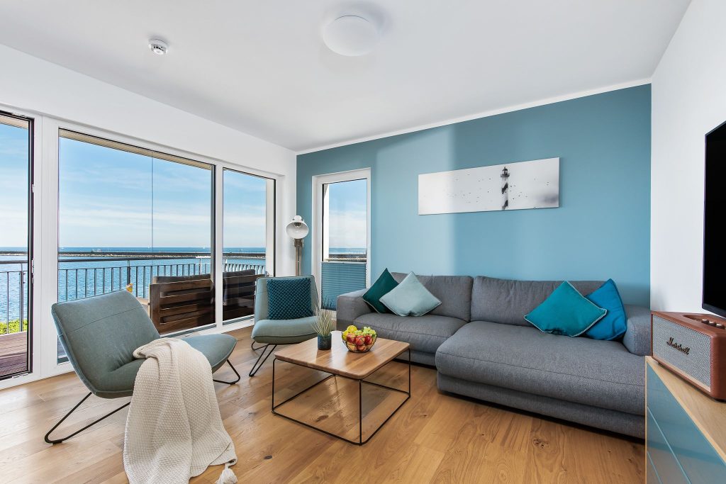 Vom Wohn- und Essbereich mit bodentiefen Fenstern hast Du Zugang zum Herzstück dieser Ferienwohnung, dem großen Balkon mit einem unvergesslichen Blick auf die freie Ostsee und die Hafeneinfahrt.
