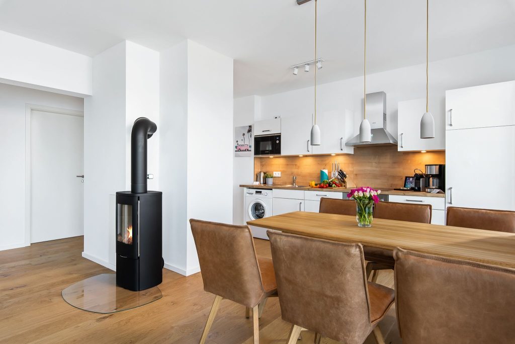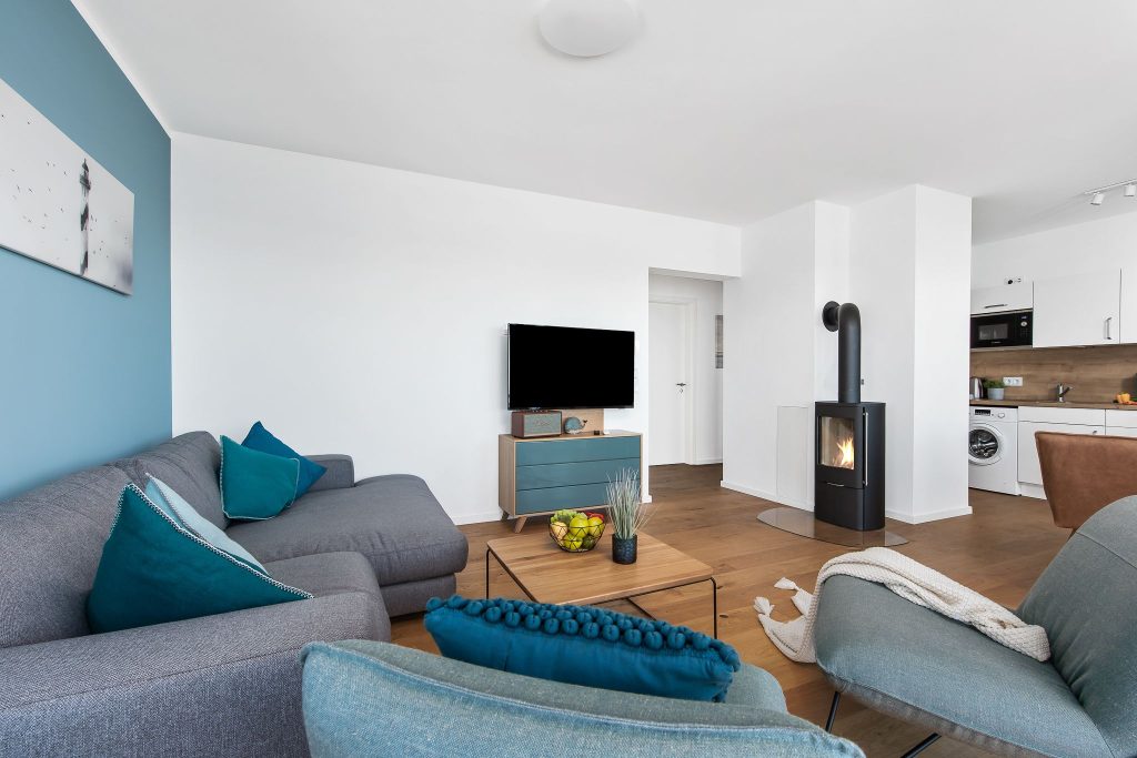 Erhole Dich an kälteren Tagen auf dem Sofa mit der wohligen Wärme des gemütlichen Kaminofens und schaue auf dem Flachbild-Fernseher Deine Lieblingsserie.