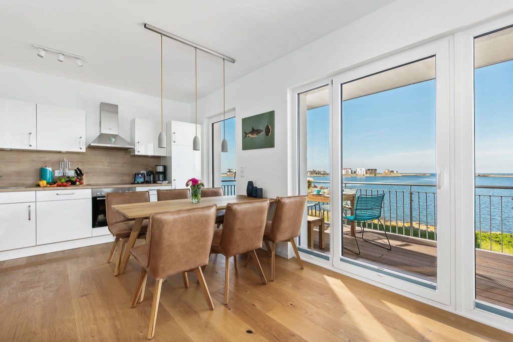 Die hochwertig ausgestattete Küche mit Meerblick ist offen zum Wohn- und Essbereich gestaltet und lädt Dich zu gemeinsamen Kochabenden ein.