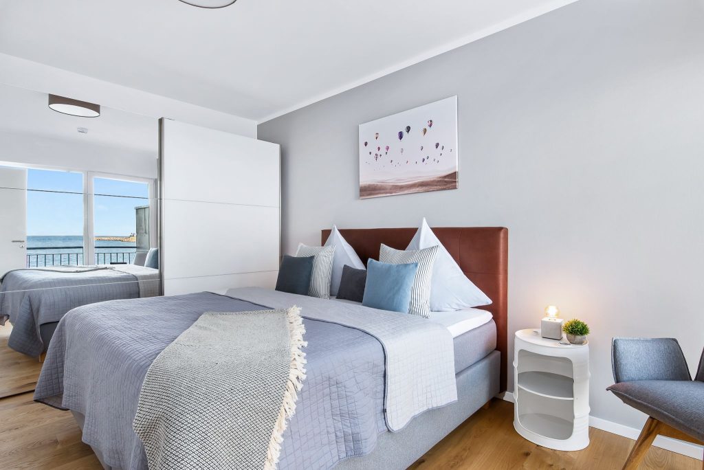 Diese Ferienwohnung verfügt über zwei komfortable Doppelschlafzimmer mit Boxspringbetten (180 x 200 cm), Kleiderschränken und Verdunkelungsmöglichkeiten, eines mit TV und eines mit Wasserblick.