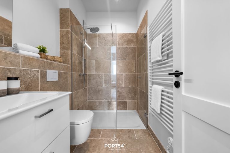 Im modernen Badezimmer findest du eine ebenerdige Dusche, WC, Föhn, Handtuchtrockner und Naturstein-Fliesen.
