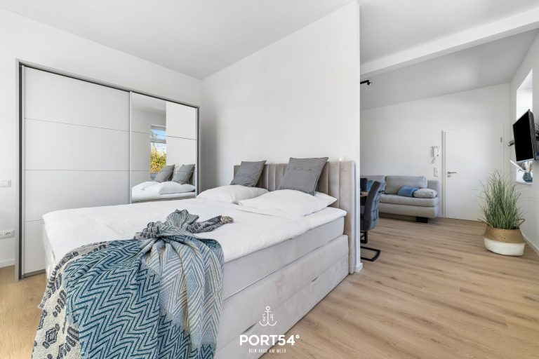 Im Schlafbereich steht Dir ein gemütliches Doppelbett (180 × 200 cm) für eine erholsame Nachtruhe zur Verfügung. Zwei weitere Schlafplätze bietet Dir die gemütliche Schlafcouch (160 × 200 cm) im Wohnbereich.