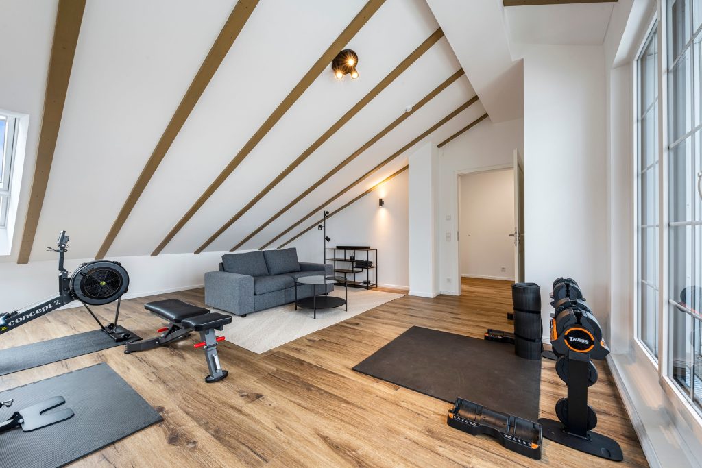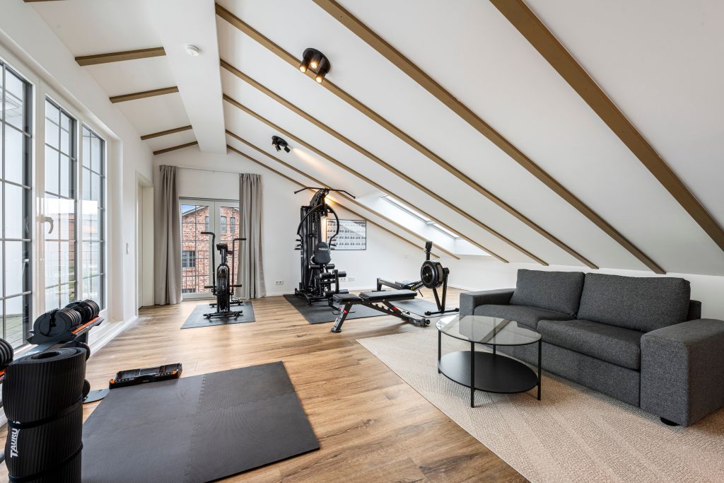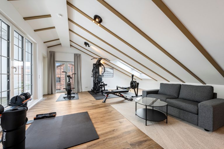 Ein sehr gut ausgestatteter Fitnessraum ist ein weiteres Highlight dieser exklusiven Maisonettewohnung. Direkt in der Wohnung integriert, bietet dieser private Raum alles, was Sie für ein effektives und angenehmes Workout benötigen – moderne Geräte, ausreichend Platz und eine Atmosphäre, die Sie motiviert, Ihre Fitnessziele zu erreichen. Der besondere Clou: Der Fitnessraum verfügt über einen direkten Zugang zur Dachloggia, sodass Sie nach einer intensiven Trainingseinheit direkt an der frischen Luft entspannen können.