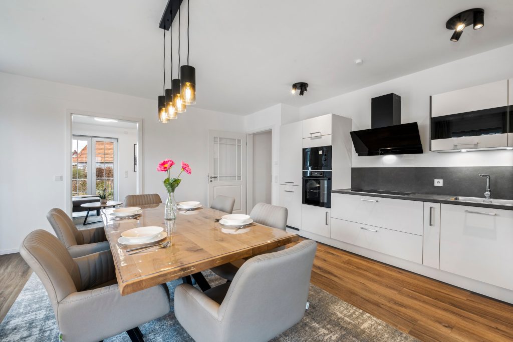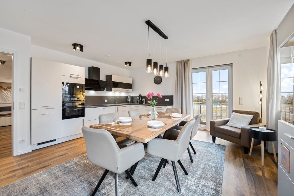 Der offene Zugang zur modernen Küche ermöglicht es Ihnen, Ihre Lieblingsgerichte selbst zuzubereiten.