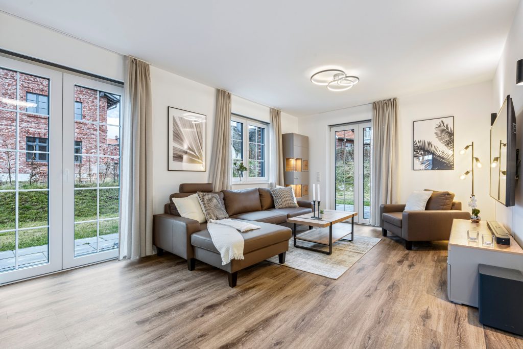 - großzügiger Wohn-Essbereich mit Sofa, TV und Zugang zur Terrasse