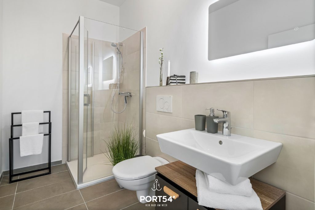Das Badezimmer verfügt über ein Waschbecken, ein WC und eine Dusche. Die Fenster der Wohnung sind mit Insektenschutzgittern und Sichtschutzplissees ausgestattet.