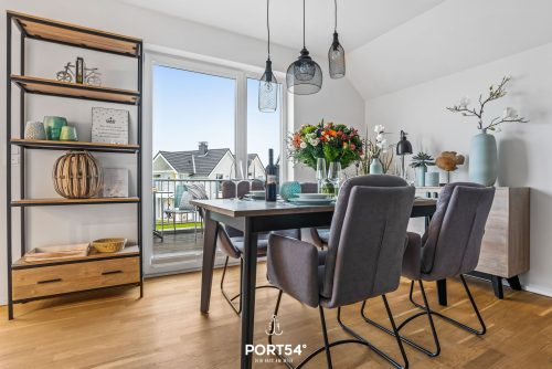 Ein besonderes Highlight ist der Eckbalkon mit Gartenmöbeln und eindrucksvollem Deichblick. Hier kannst du entspannen oder das maritime Ambiente in vollen Zügen genießen.