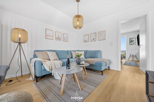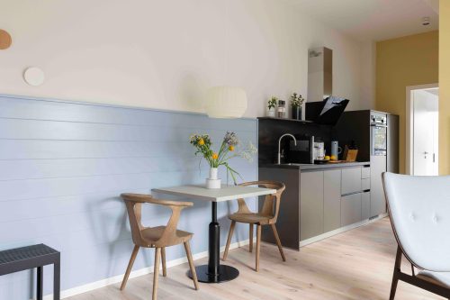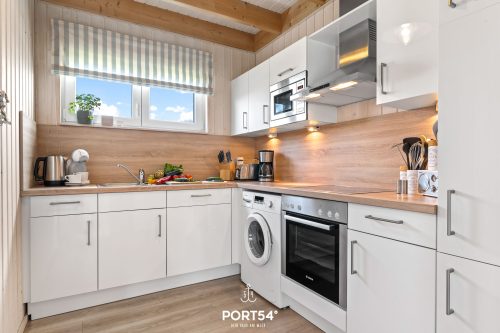 Das separate Schlafzimmer ist mit einem komfortablen Doppelbett (180 × 200 cm) für erholsamen Schlaf ausgestattet. Im Wohnbereich befindet sich ein Schlafsofa (170×200 cm), das zusätzliche Schlafmöglichkeiten für weitere Gäste bietet. Die moderne, offen zum Wohnbereich gestaltete Küche erfüllt mit Induktionsherd, Backofen, Spülmaschine, Kühlschrank mit Gefrierfach, Kaffeemaschine, Mixer, Heißluftfritteuse sowie umfassenden Küchenutensilien sämtliche kulinarischen Wünsche.