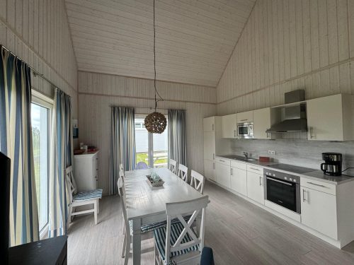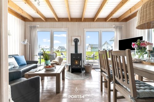 Im Inneren erwartet dich ein offener, geschmackvoll gestalteter Wohn- und Essbereich mit Schlafsofa, großem Esstisch, modernem TV und zuverlässigem WLAN. Für ein besonders angenehmes Wohngefühl sorgt die Fußbodenheizung.