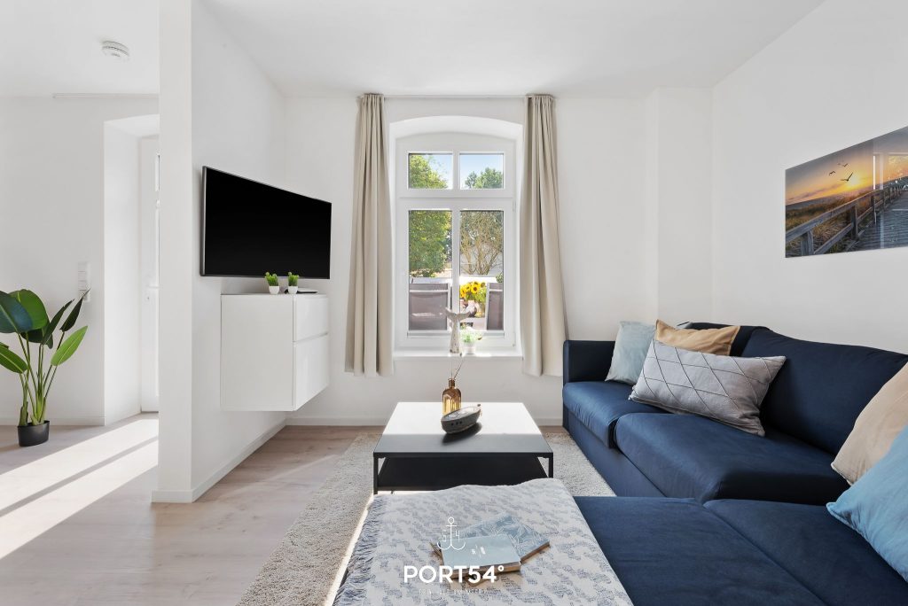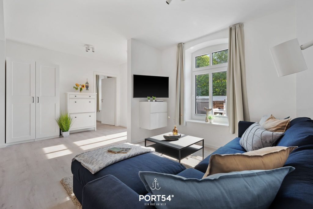 Im gemütlichen Wohnzimmer findest du ein Sofa, TV und eine HiFi-Anlage. WLAN steht dir kostenfrei...