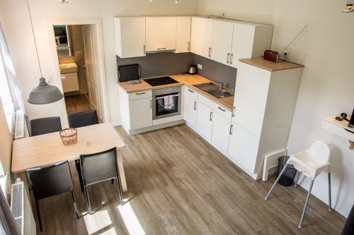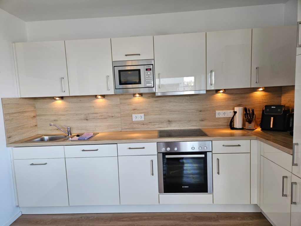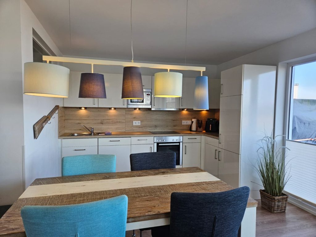 Die hochwertige offene Küche ist voll ausgestattet und lässt mit Mikrowelle, Spülmaschine, Espresso- und Kaffeemaschine, Wasserkocher und Toaster keine Wünsche offen. Auch auf Küchenutensilien und ausreichend Geschirr sowie Besteck wurde Wert gelegt.
