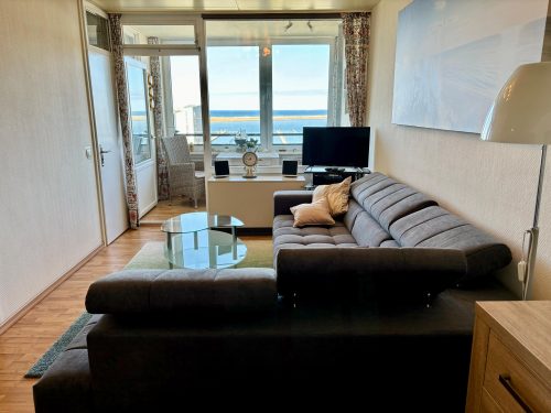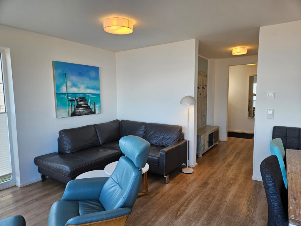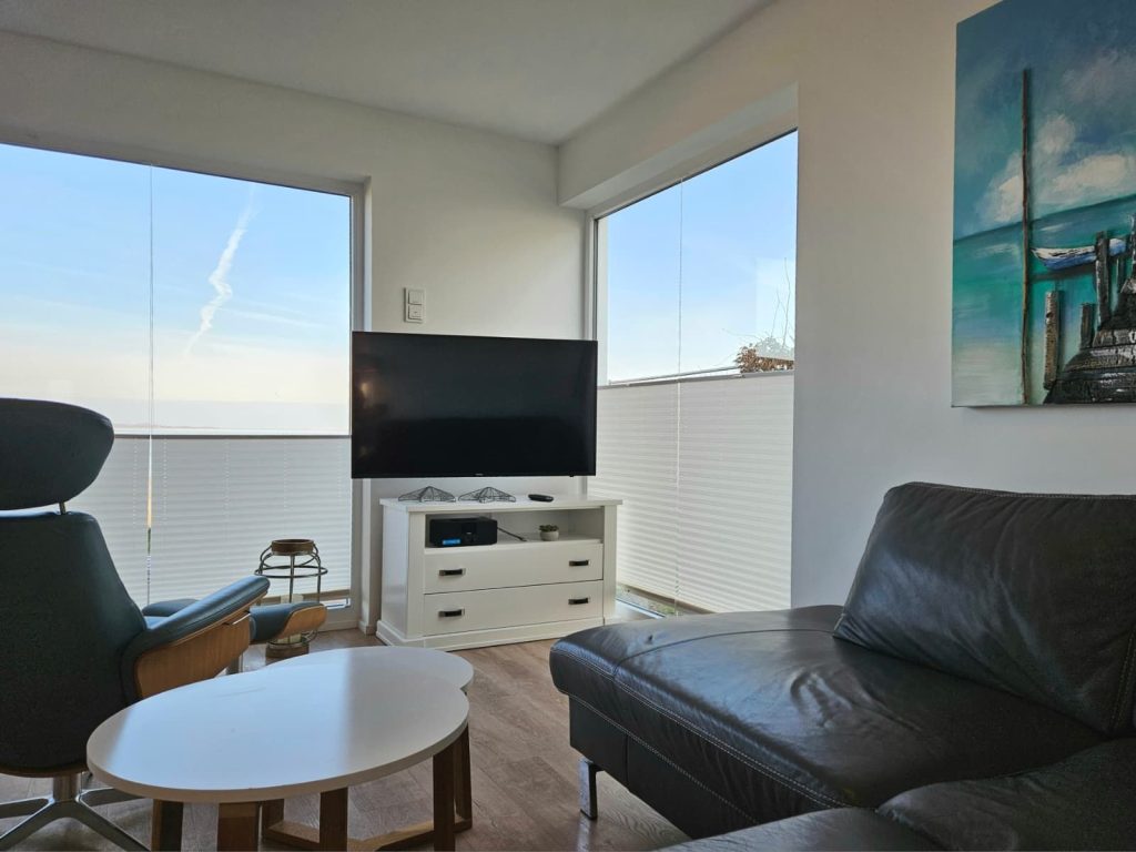 Der offene Wohnbereich mit Wasserblick vereint Gemütlichkeit mit moderner Ausstattung: Ein komfortables Sofa, Sessel, ein Esstisch und ein TV sorgen für Unterhaltung und Erholung auch an weniger sonnigen Tagen.