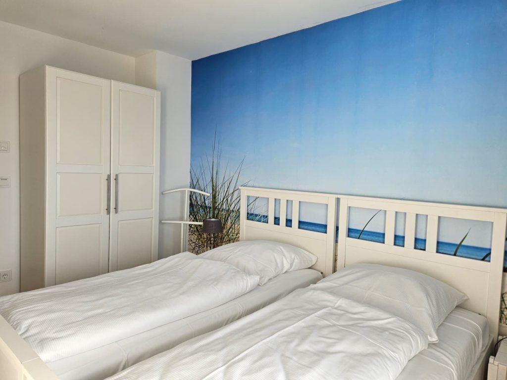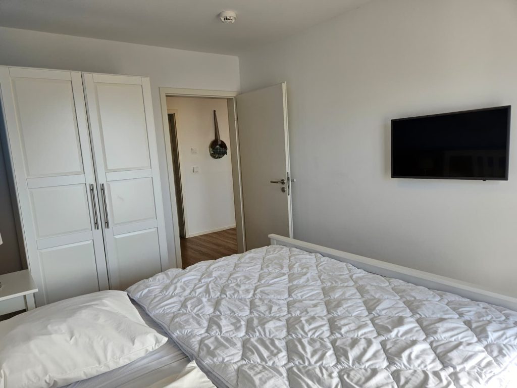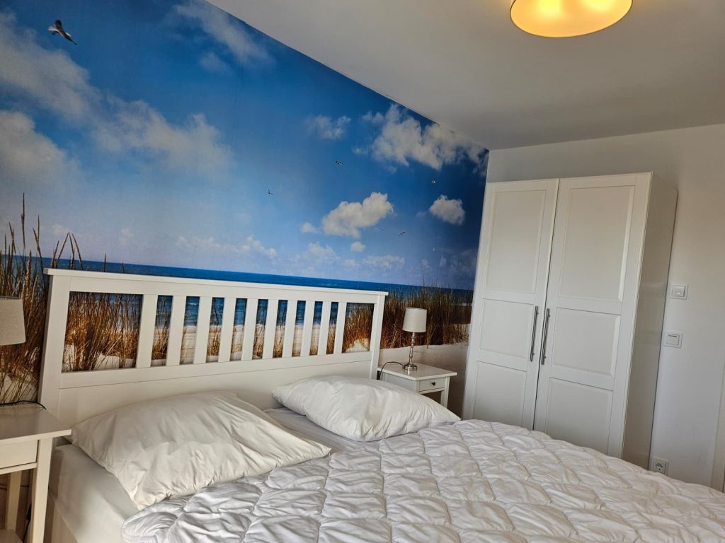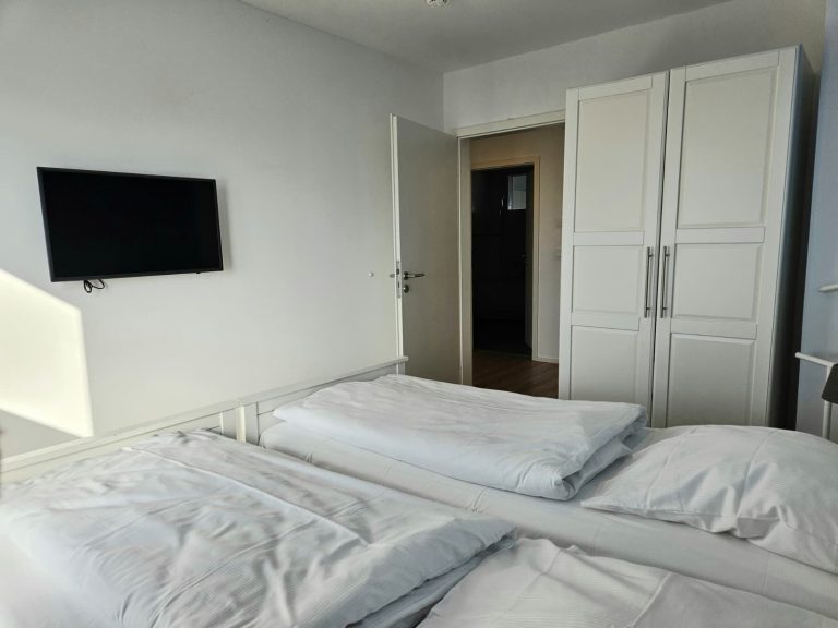 Die Wohnung verfügt über zwei Schlafzimmer mit insgesamt vier Schlafmöglichkeiten. Eines der Schlafzimmer ist mit einem Doppelbett, das andere mit 2 Einzelbetten, ausgestattet. Beide Schlafzimmer verfügen ebenfalls über je einen TV, Verdunkelungsmöglichkeiten und einem Kleiderschrank.