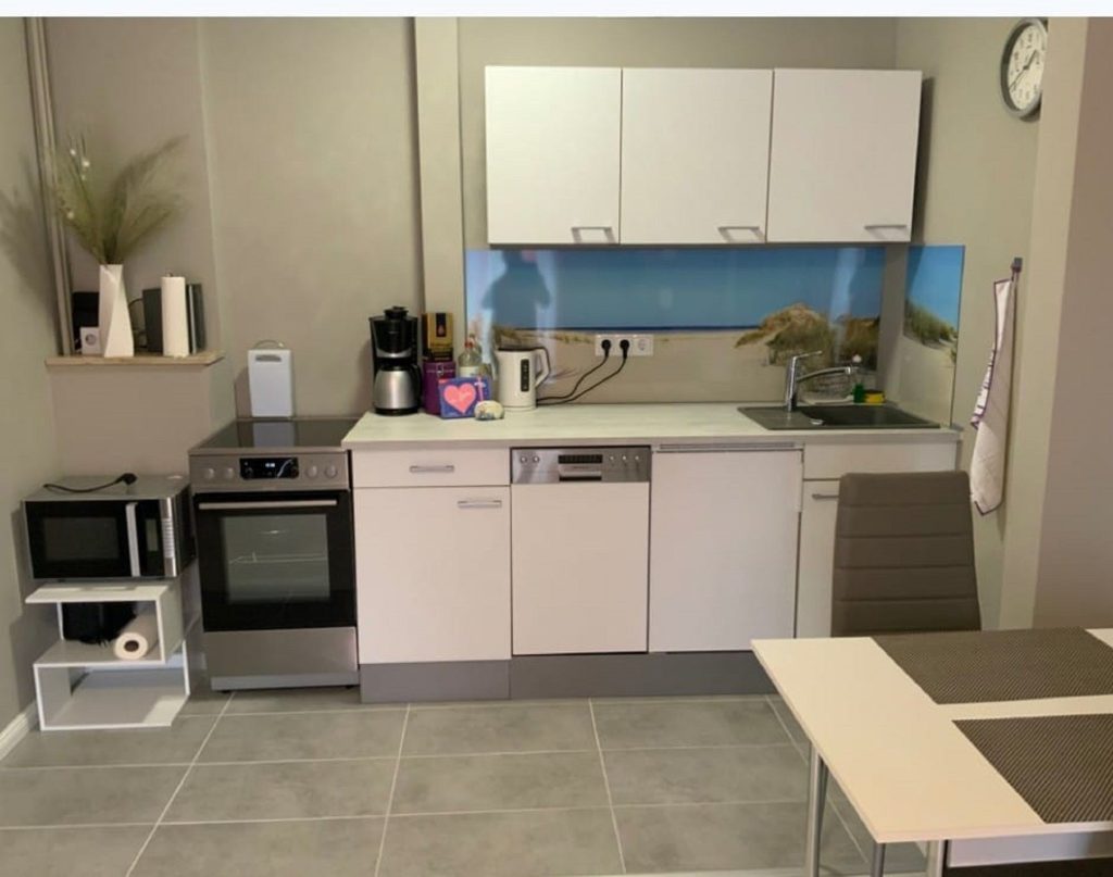 Die offene Küche ist harmonisch in den Wohnraum integriert und bietet mit Ceranfeld, Backofen, Mikrowelle, Geschirrspüler sowie Kühlschrank mit Gefrierfach eine komfortable Ausstattung für deine Selbstversorgung. Kaffeemaschine, Bosch-Tassimo, Wasserkocher, Toaster und Eierkocher ergänzen das Angebot.