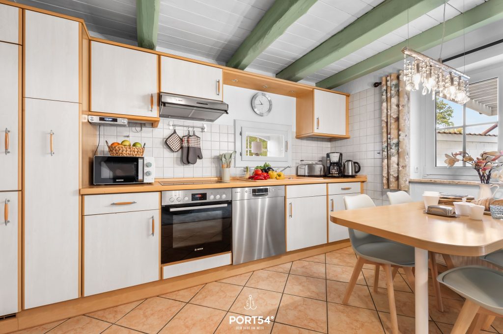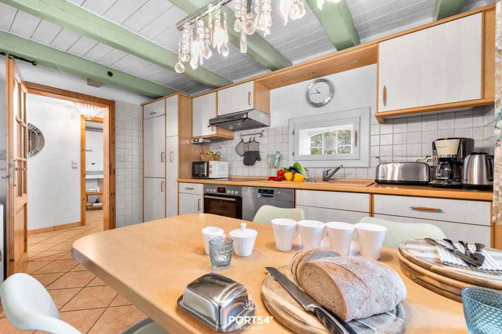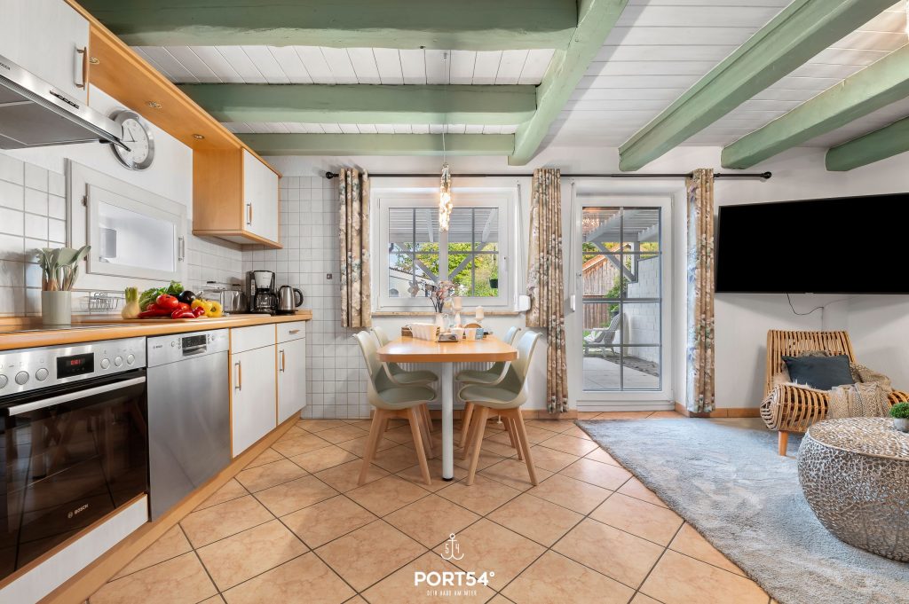 Die offene Küche und der Wohnbereich grenzen direkt an die überdachte Terrasse. In der Küche finden Sie alles für den perfekten nächsten Kochabend und im Wohnbereich können Sie es sich auf dem Sofa vor dem Fernseher bequem machen.