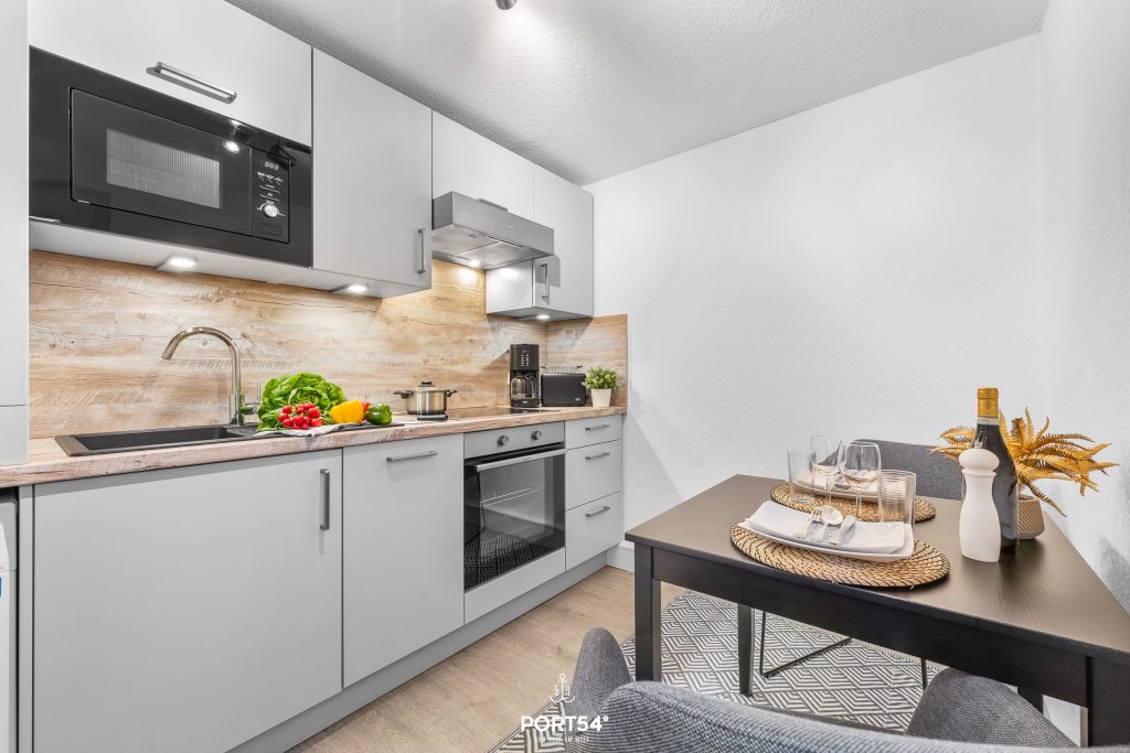 Die geschlossene Küche ist vollständig ausgestattet und bietet alles für eine flexible Selbstverpflegung: Ceran-Herd, Backofen, Mikrowelle, Geschirrspülmaschine, Kühlschrank mit Gefrierfach, Kaffeemaschine, Wasserkocher, Toaster, Eierkocher sowie ausreichend Küchenutensilien, Geschirr und Besteck. Eine Erstausstattung ist vorhanden. Von der Küche aus gelangen Sie direkt auf die Terrasse.