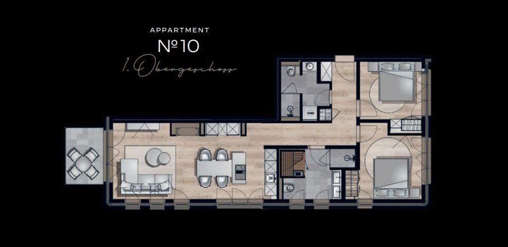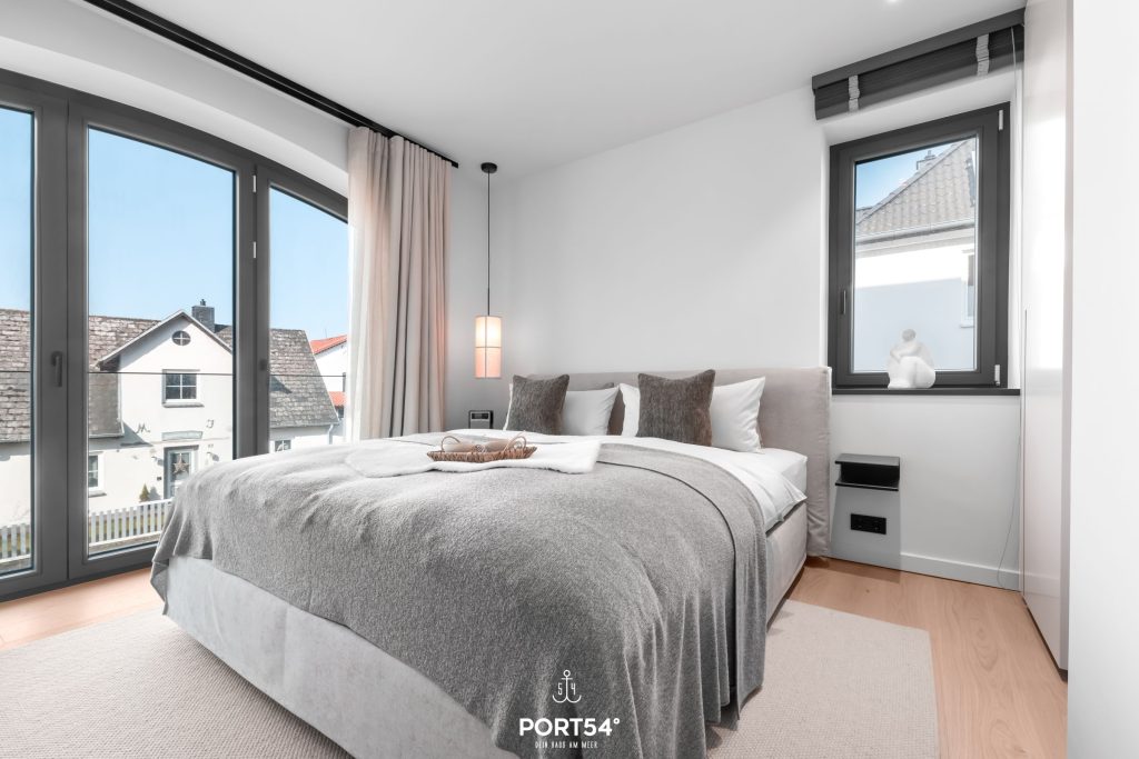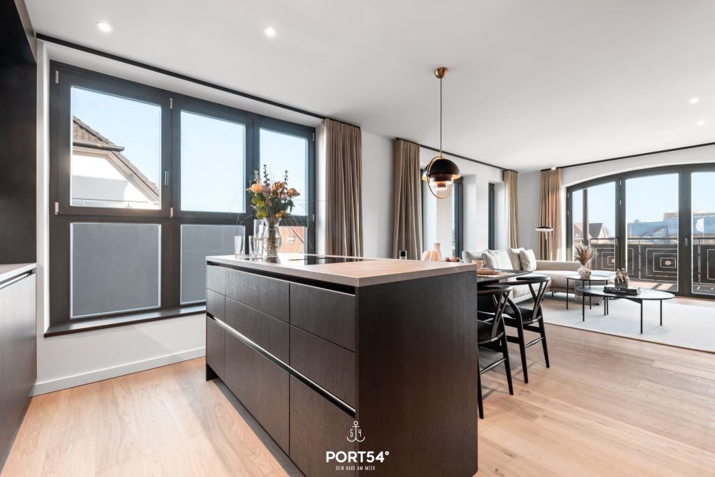 Die individuelle Ausstattung der Suite sorgt für höchsten Komfort und eine angenehme Wohlfühlatmosphäre. Mit zwei stilvoll eingerichteten Schlafzimmern mit je einem Doppelboxspringbett der Marke Schramm (Bettgröße 180x200 cm) und zwei modernen Badezimmern findest du genügend Raum zum Entspannen und Erholen. Die offene SieMatic-Küche ist mit hochwertigen Geräten ausgestattet, darunter ein Induktionsherd, ein Elektro-Backofen, eine Spülmaschine und ein Quooker, der problemlos heißes Wasser sowie Sprudelwasser erzeugen kann. Hier kannst du gemeinsam köstliche Mahlzeiten zubereiten und im einladenden Essbereich genießen.