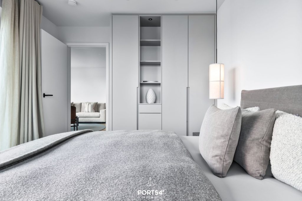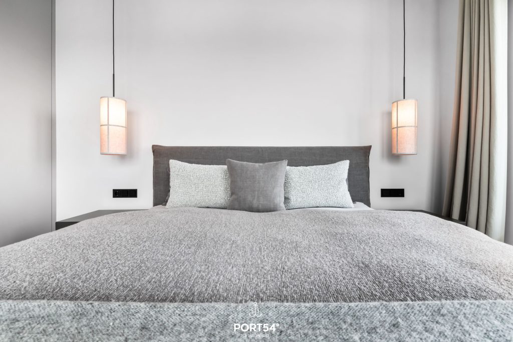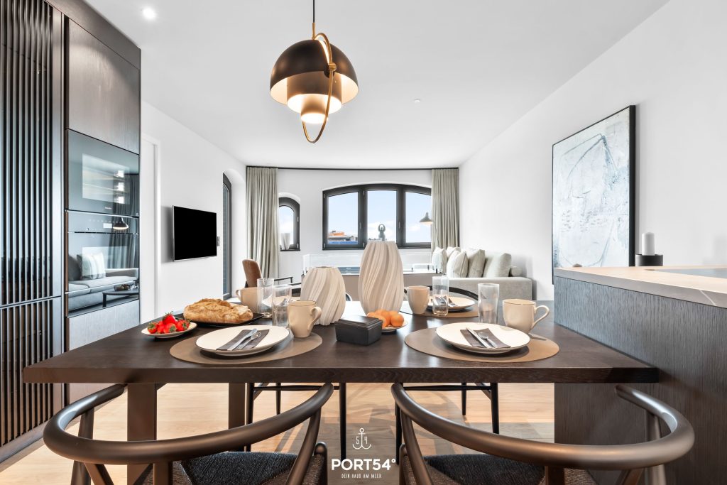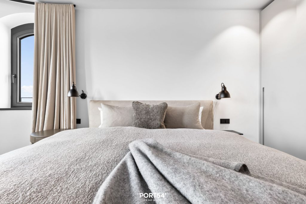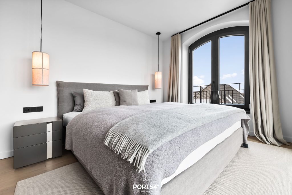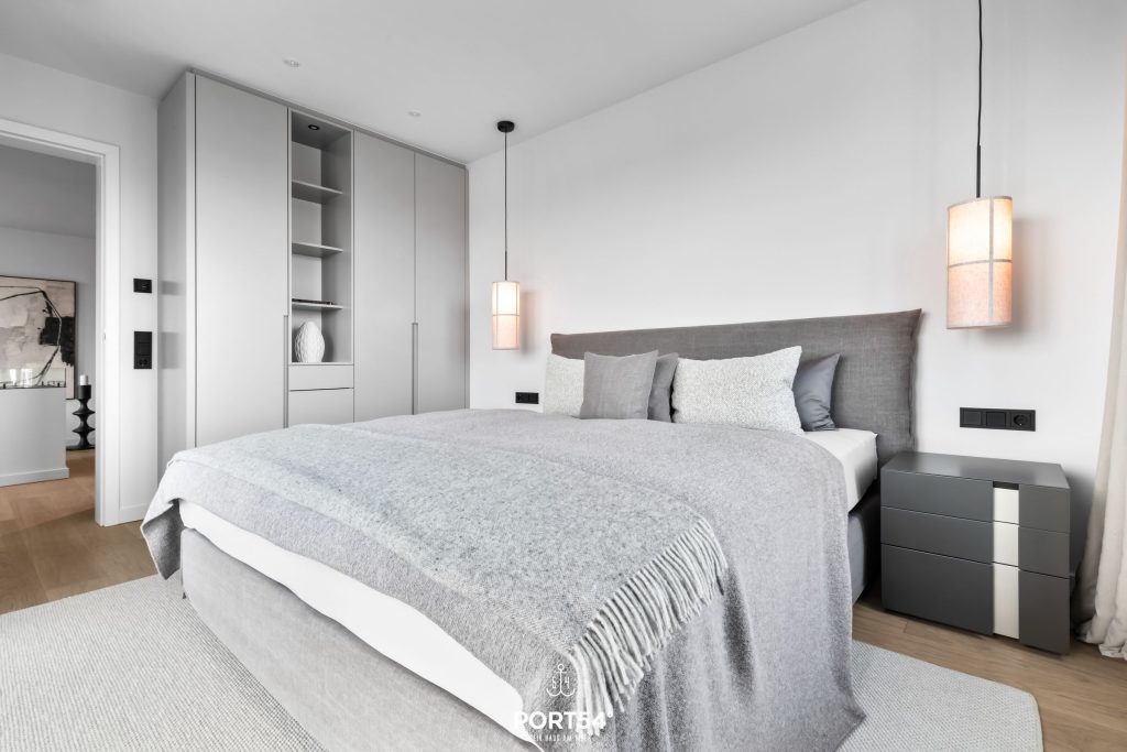 Viele Möbel der hochwertigen Einrichtung stammen aus dem Hause der Bornhold Manufaktur in Hamburg und wurden nach Maß angefertigt. Die 180x200 cm großen Betten von Schramm sowie Möbel von Marken wie ASCO, Jacaranda, Christine Knöcke und VIPP stehen für den Anspruch und die Qualität in dieser Ferienwohnung.