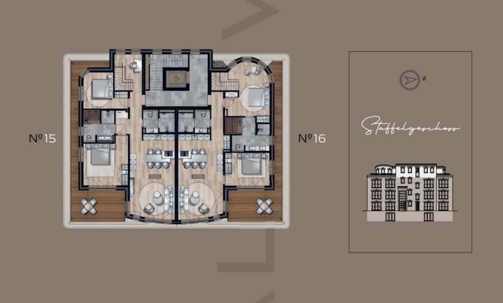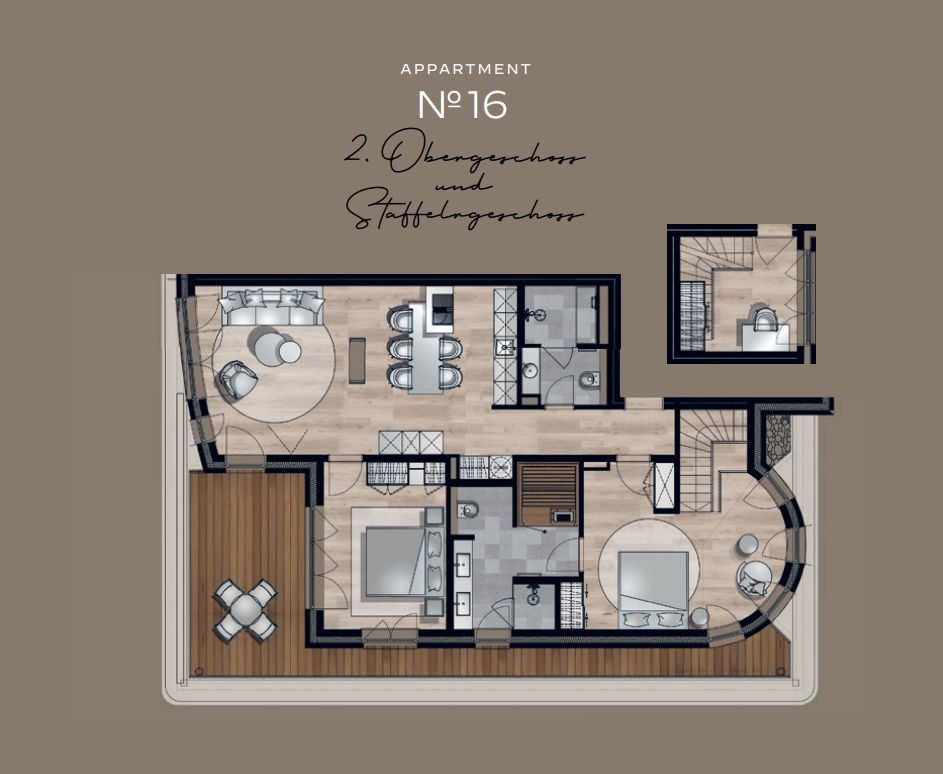 Das Penthouse im zweiten und dritten Stock verfügt über zwei gemütliche Schlafzimmer, die mit hohen Decken und modernen Möbeln ausgestattet sind. Hier findest du den perfekten Ort für erholsamen Schlaf. Neben einem geschmackvoll eingerichteten Wohnzimmer, das zum Verweilen einlädt, erwartet dich auch ein offener Essbereich, der sich ideal für gemeinsame Mahlzeiten eignet. Die große, mit Fußbodenheizung ausgestattete Fläche sorgt für ein angenehmes Raumklima, während der offene Ethanol Kamin nicht nur Wärme spendet, sondern auch eine behagliche Atmosphäre schafft. Von einem Schlafzimmer aus gelangst du über eine Treppe ins zweite OG, dort steht ein Schreibtisch für dich, perfekt für diejenigen, die remote unterwegs sind.