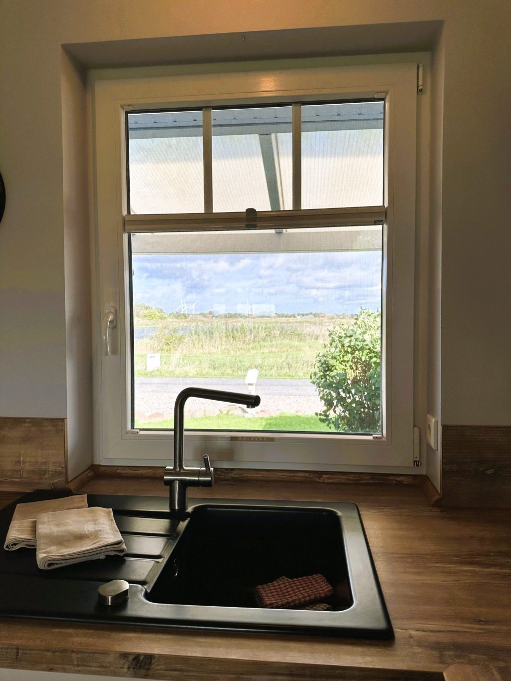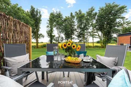 Die überdachte Terrasse lädt zum Entspannen im Freien ein. Hier können Sie Ihre Mahlzeiten genießen, ein Buch lesen oder einfach die frische Nordseeluft und die herrliche Aussicht auf die umliegende Landschaft und den gepflegten Garten genießen. Fliegengitter sorgen für eine insektenfreie Atmosphäre im Haus.