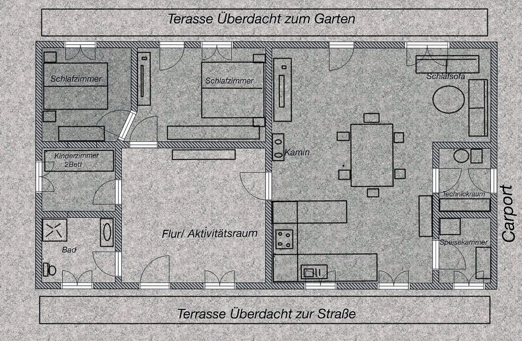 Der große Flur des Ferienhauses beherbergt einen Kicker Tisch und eine elektrische Dartscheibe, die zu unterhaltsamen Spielen und geselligen Abenden einladen. Hier ist genügend Platz für Aktivitäten und gemeinsame Zeit mit der Familie oder Freunden.