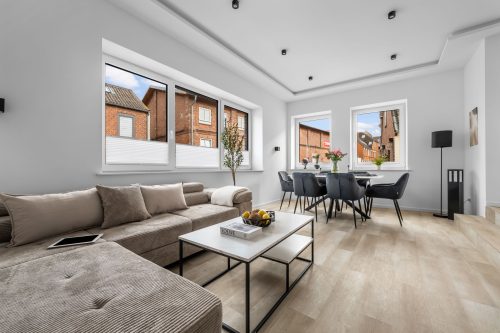 Das Herzstück der Wohnung ist der offene Wohnbereich, der mit einer hochwertigen SieMatic Küche und einem stilvollen Essbereich ausgestattet ist. Hier kannst du kulinarische Köstlichkeiten zubereiten und gemeinsam am Esstisch genießen. Der gemütliche Wohnbereich mit Sofa, Smart TV und Ethanol Kamin lädt dazu ein, entspannte Abende zu verbringen. Genieße die Wärme des Kamins und lass den Tag Revue passieren.